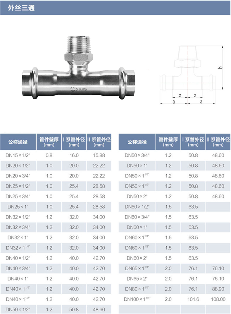 外丝三通丨材质(Grade): 304/304L、316L 丨原料来源(Source of raw materials): 全部符合相关国家标准要求,用料来源酒钢、太钢、张浦、东特等 丨焊接方式(Welding method): 氩弧焊或等离子焊(TIG OR PLASMA在线)+氩弧焊(TIG离线) 丨执行标准(Executive standard): GB/T 19228.2-2011 GB/T12771 丨参数对照表(Parameters):