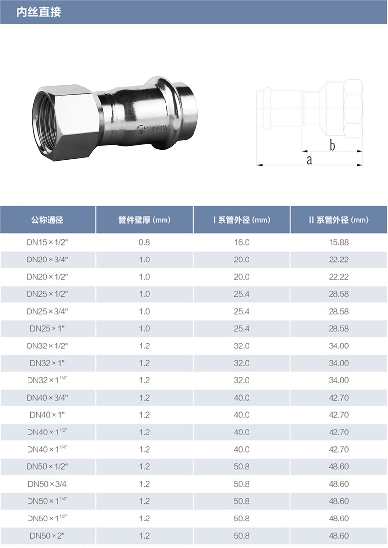 丨质量体系(Quality system): 公司拥有ISO9001质量管理体系认证和压力管道元件制造许可证,具有健全的质量检测控制体系,配备设立了工业CT、化学分析、涡流检测、水压试验、气密性试验、万能试验机等检验环节或检测设备,并建立了以顾客满意为目标的售后服务体系,保证产品质量,满足顾客需求 场景应用 (Application): 医院、地铁站、学校、会议中心、机场、家庭用水、小区二次供水、终端家装等 丨关于运输(Transport): 普通运输,打捆不包装运输;特殊运输 打捆外包(包、箱、防护集装箱)运输。 如有其它特殊要求请咨询在线客服或致电:13573388823。 丨连接方式及安装步骤(Connection method): 双卡压式、沟槽式、承插焊接式 丨产品图片(Product Pictures):