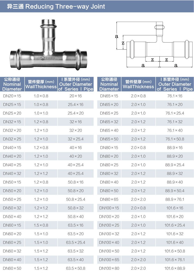 异接三通丨材质(Grade): 304/304L、316L 丨原料来源(Source of raw materials): 全部符合相关国家标准要求,用料来源酒钢、太钢、张浦、东特等 丨焊接方式(Welding method): 氩弧焊或等离子焊(TIG OR PLASMA在线)+氩弧焊(TIG离线) 丨执行标准(Executive standard): GB/T 19228.2-2011 GB/T12771 丨参数对照表(Parameters):