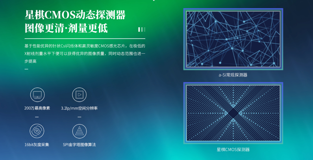 在产品的性能参数设计上,悦画的像素可达到200万,空间分辨率可达到3.2线对,采用16bit的影像灰度,悦画在影像后处理上,通过SPI金字塔图像算法,支持摄影、脉冲透视影像、连续透视等多种模式下的影像采集,动态透视影像视频支持保存与回放。双大屏的设计,透视影像支持三档放大,保证临床影像读取的便利。