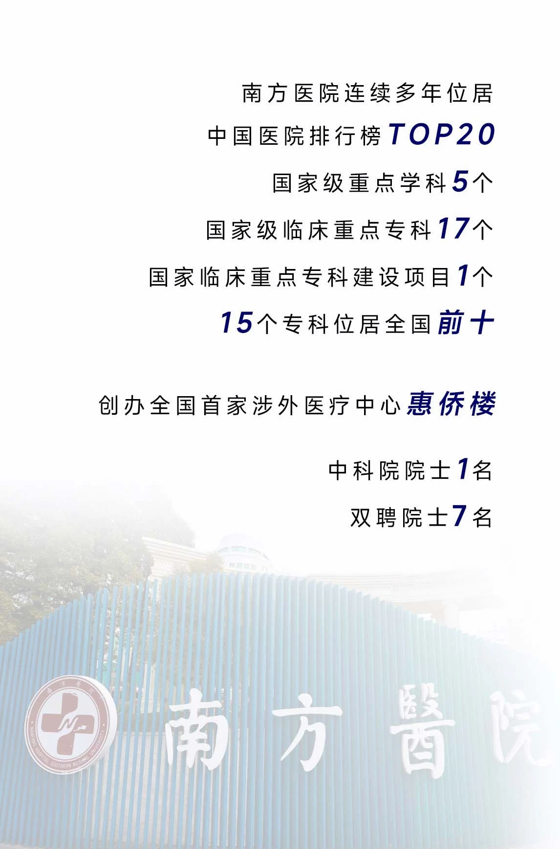 南方医科大学南方医院自1941年创建以来,至今已有八十余年历史。医院历经“五变隶属”、“四迁院址”、“十易院名”在历史的河流中熠熠生辉。现如今已发展成为综合实力雄厚、学科特色突出,集医疗、教学、科研和预防保健为一体的大型综合性三级甲等医院,是广东省高水平医院“登峰计划”首批重点建设单位,拥有国家级重点学科5个、国家级临床重点专科17个,亦是全国百佳医院之一,综合排名在国内权威排行榜中稳居综合医院第一梯队。
