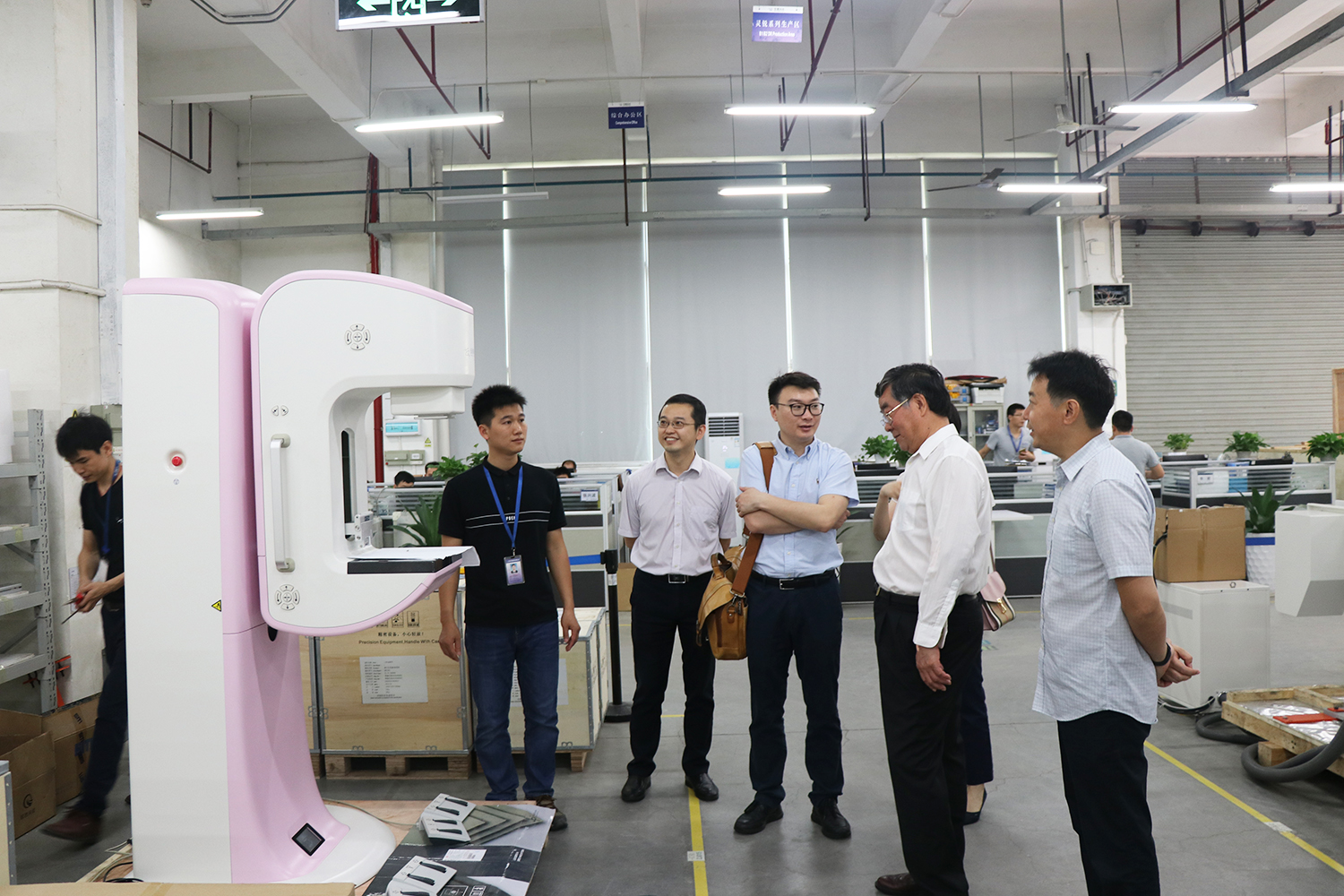 在公司领导的陪同下,中国医学装备协会副理事长王东升一行依次听取了公司介绍、动态DR产品介绍,参观了公司核心部件生产区及整机生产区。在参观讲解过程中,中国医学装备协会副理事长王东升一行对尊龙凯时人生就是博科技的产品创新力、丰富的企业文化以及井然有序的生产管理表示肯定和赞赏。